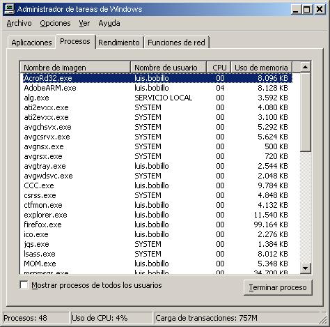 4. Dentro de esa pestaña buscamos el proceso con el nombre «Acrobat.exe» o «AcroRd32.exe», seleccionamos este proceso y pulsamos en el botón de «Finalizar Tarea».